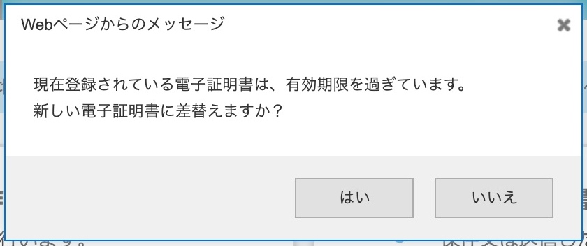 【2025年9月追記】2025年9月の手続き時はログイン直後に「Webページからのメッセージ 現在登録されている電子証明書は、有効期限を過ぎています。新しい電子証明書に差替えますか?」とのアラートも表示されましたが、調べた限り、納付手続きをするだけであればこの手続きは不要の模様。そこで「いいえ」を押して差替え作業はしませんでしたが、その後、無事に納付手続きまで完了しています。